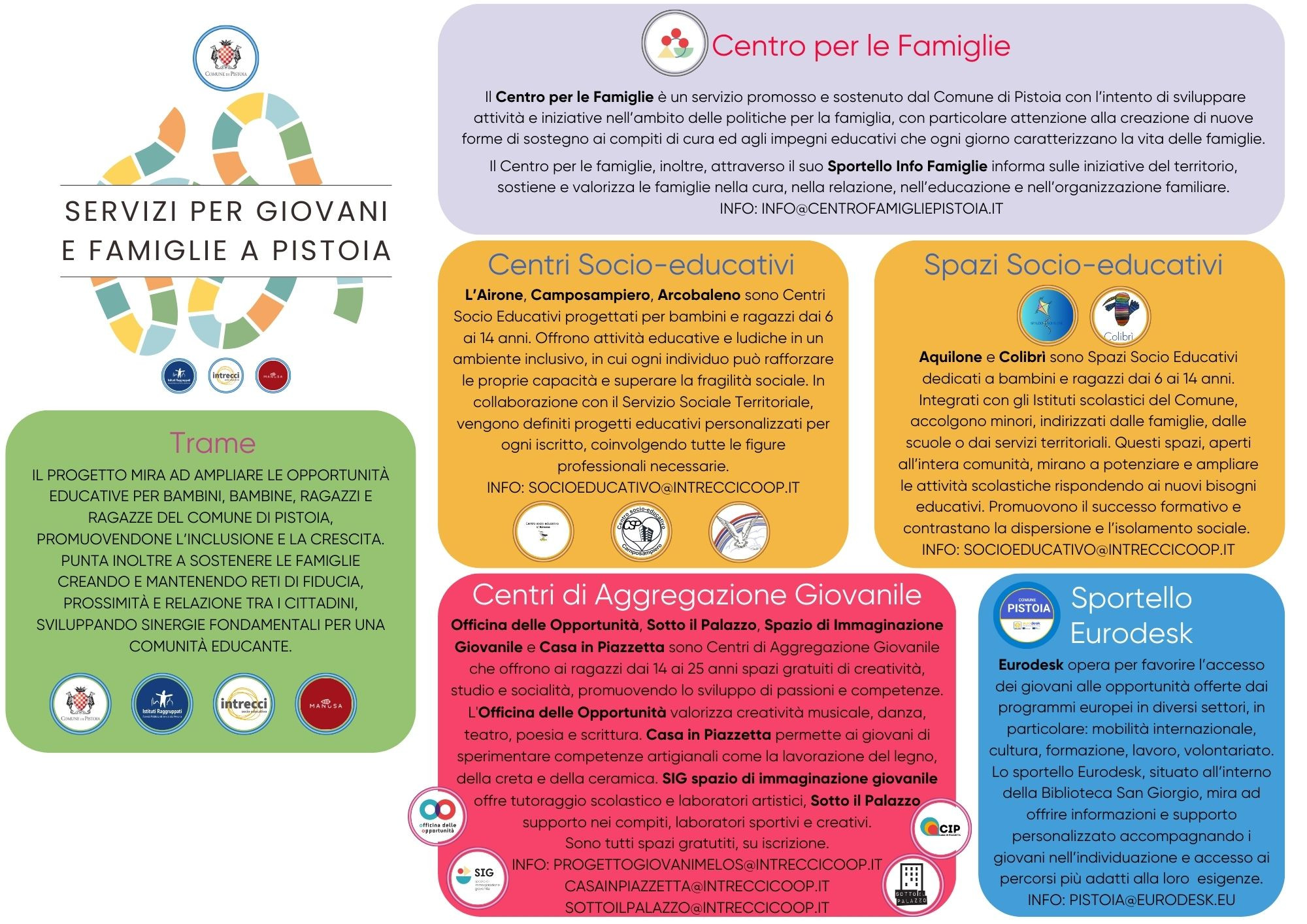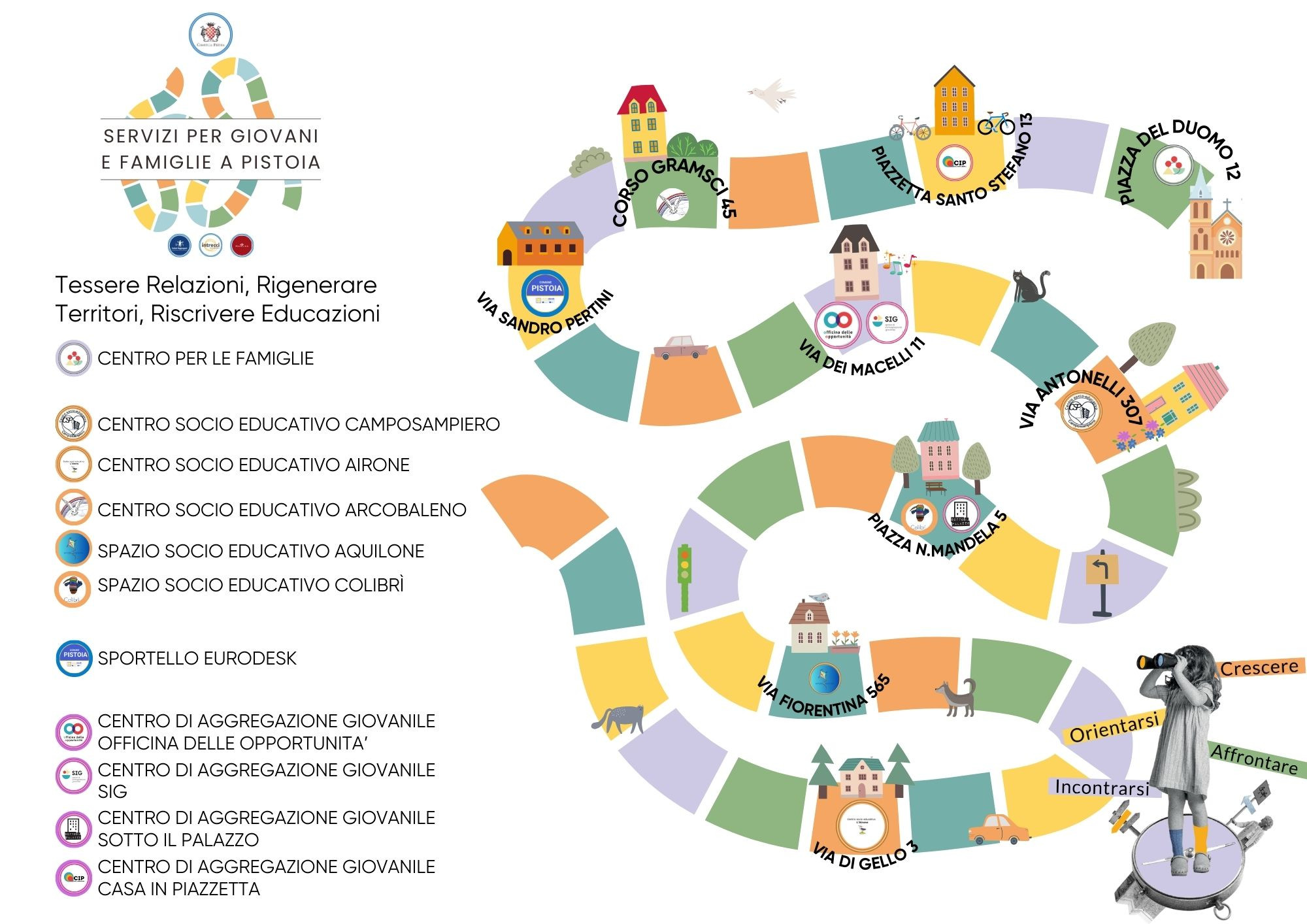 L’Amministrazione Comunale e l’Azienda Pubblica di Servizi alla Persona Istituti Raggruppati di Pistoia sono da anni impegnate in percorsi volti a sostenere la crescita dei bambini e dei ragazzi, attraverso appuntamenti ludici ed attività di animazione che favoriscano la cultura dello stare insieme e del tempo libero attraverso Centri Socio educativi, spazi compiti e spazi per i giovani con una lettura delle necessità dei ragazzi più ampia possibile, volta ad offrire opportunità e sviluppare talenti e risorse.
